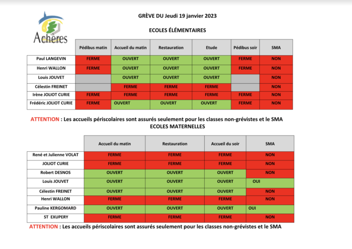 Suite au préavis de grève déposé par plusieurs organisations syndicales pour ce jeudi 19 janvier, certains accueils périscolaires seront fermés demain. Voici les modalités d’accueil mises en places par la Direction de l’Éducation. En vous remerciant de votre compréhension.
