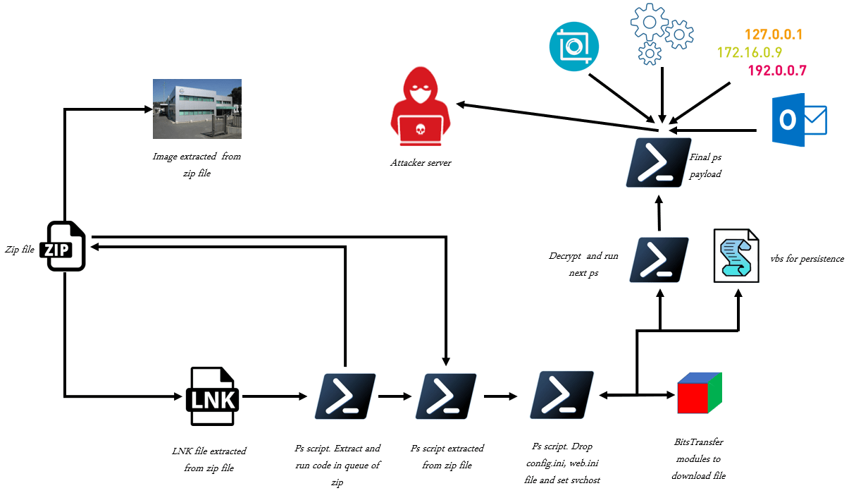 It is strange that the image is not used into the malware’s workflow, but the link file starts a complex infection chain, as shown in the following figure: